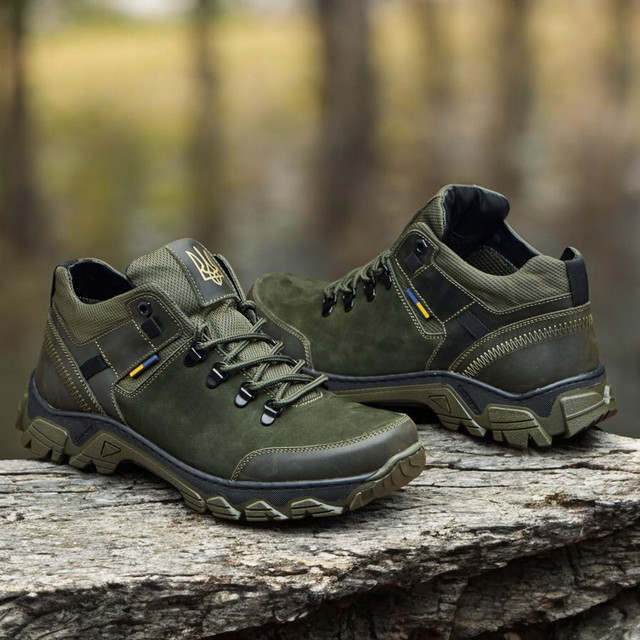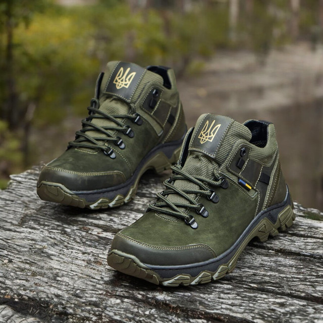 Чоловічі тактичні оливкові кросівки з гербом демісезон з високоякісного натурального нубука; військові шкіряні кроси оливка весна осінь для військових ЗСУ, розміри 40, 41, 42, 43, 44, 45