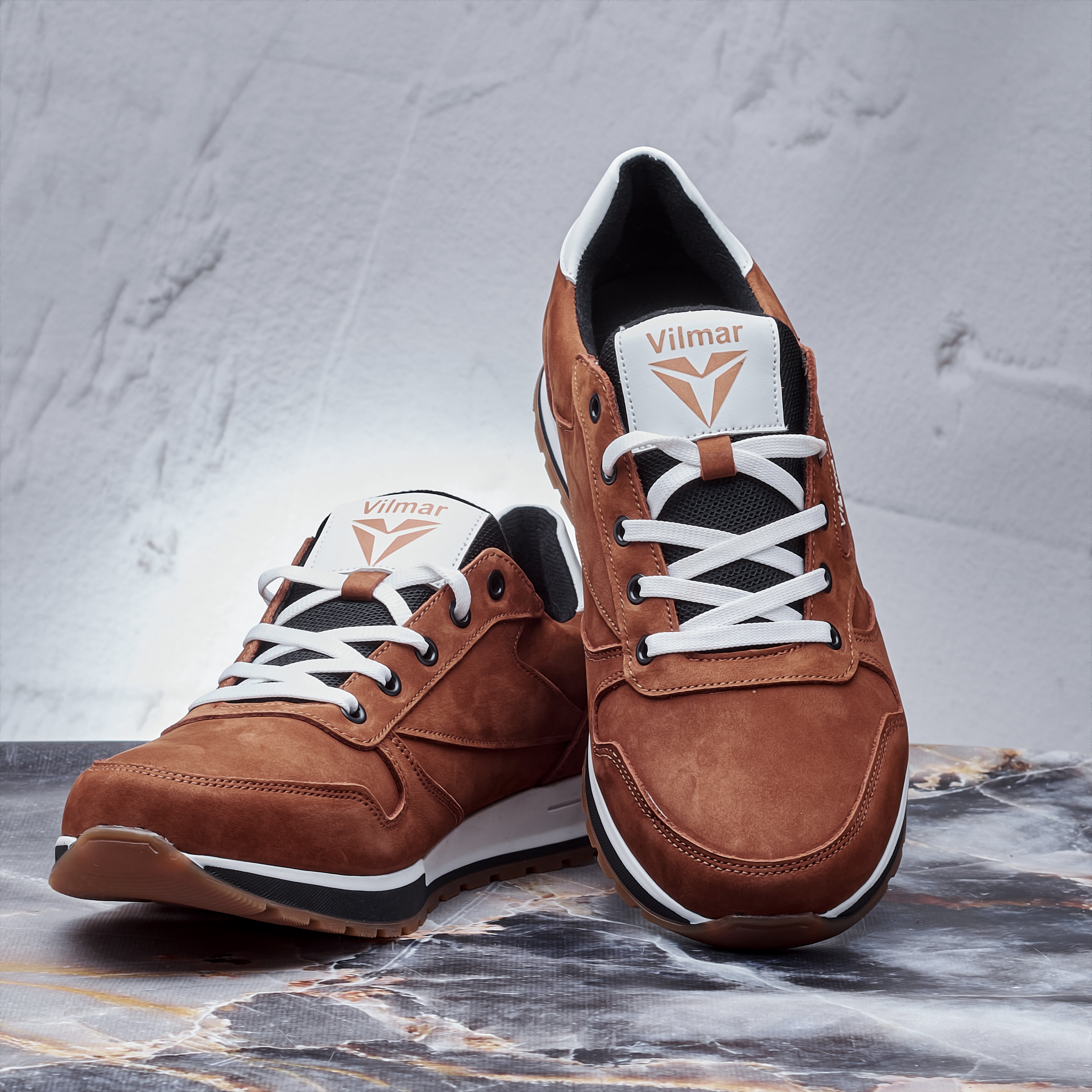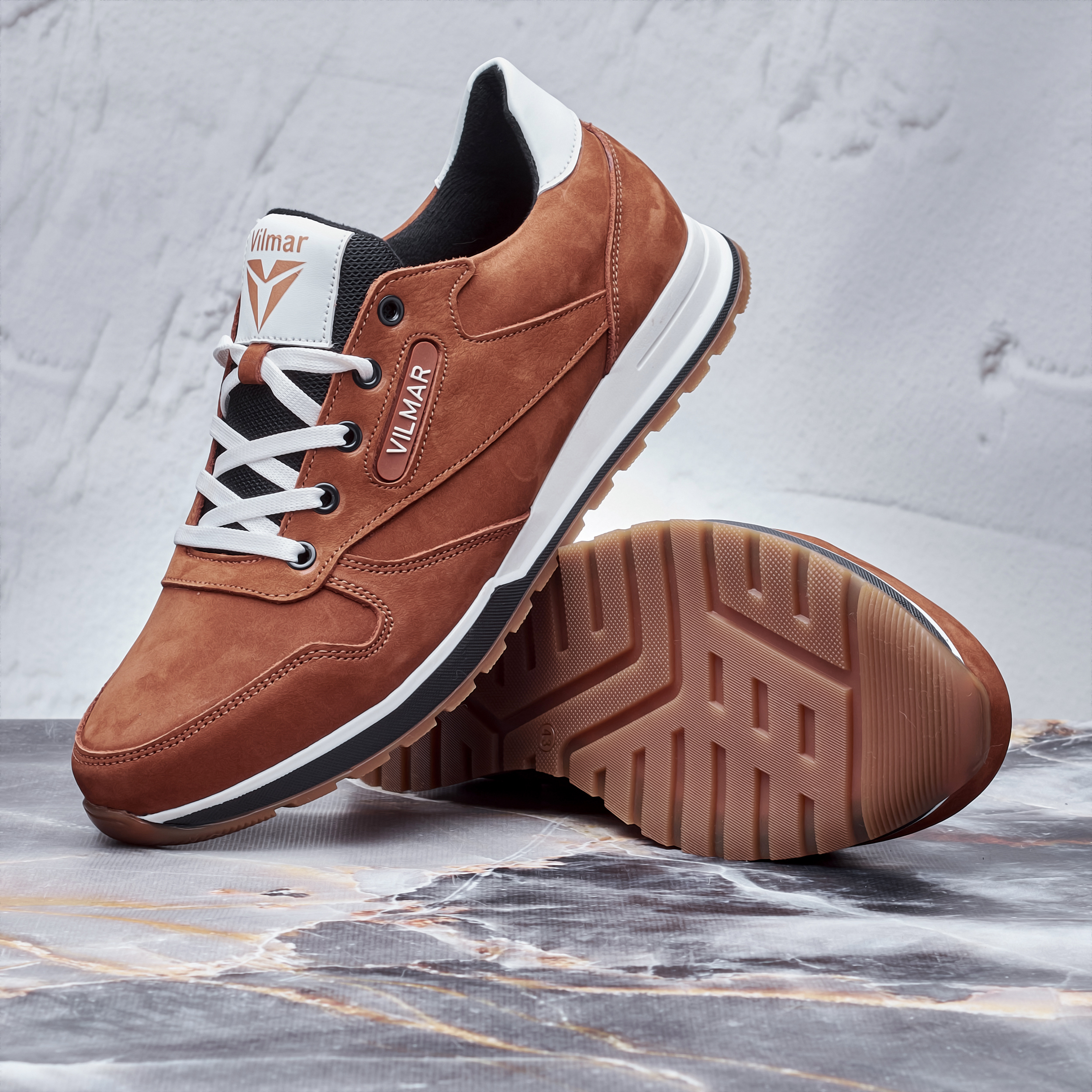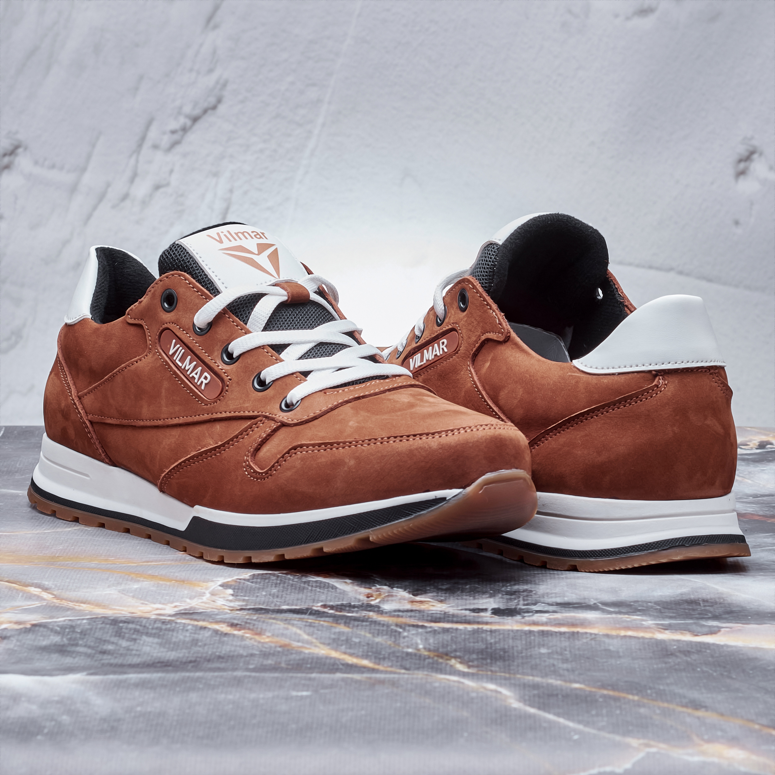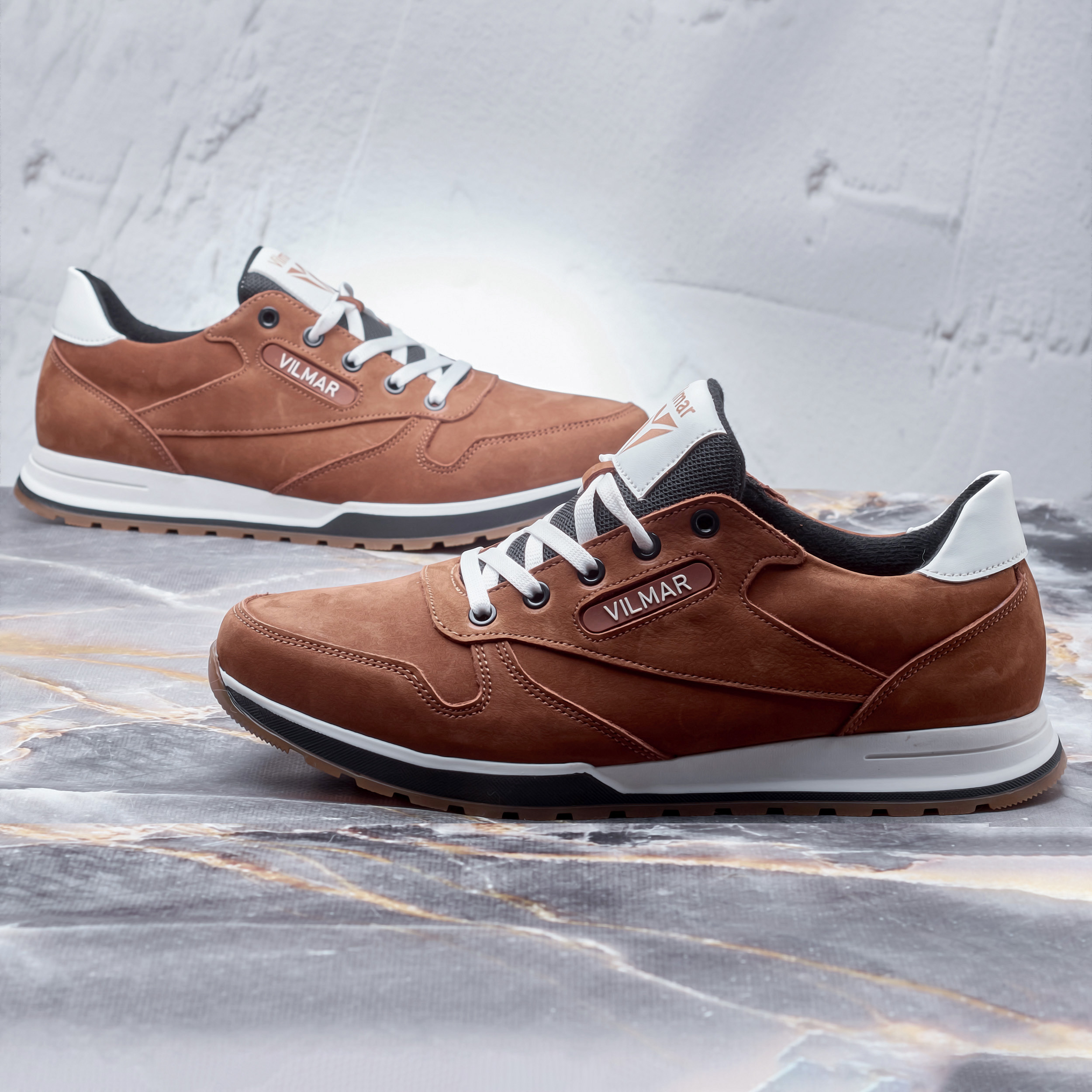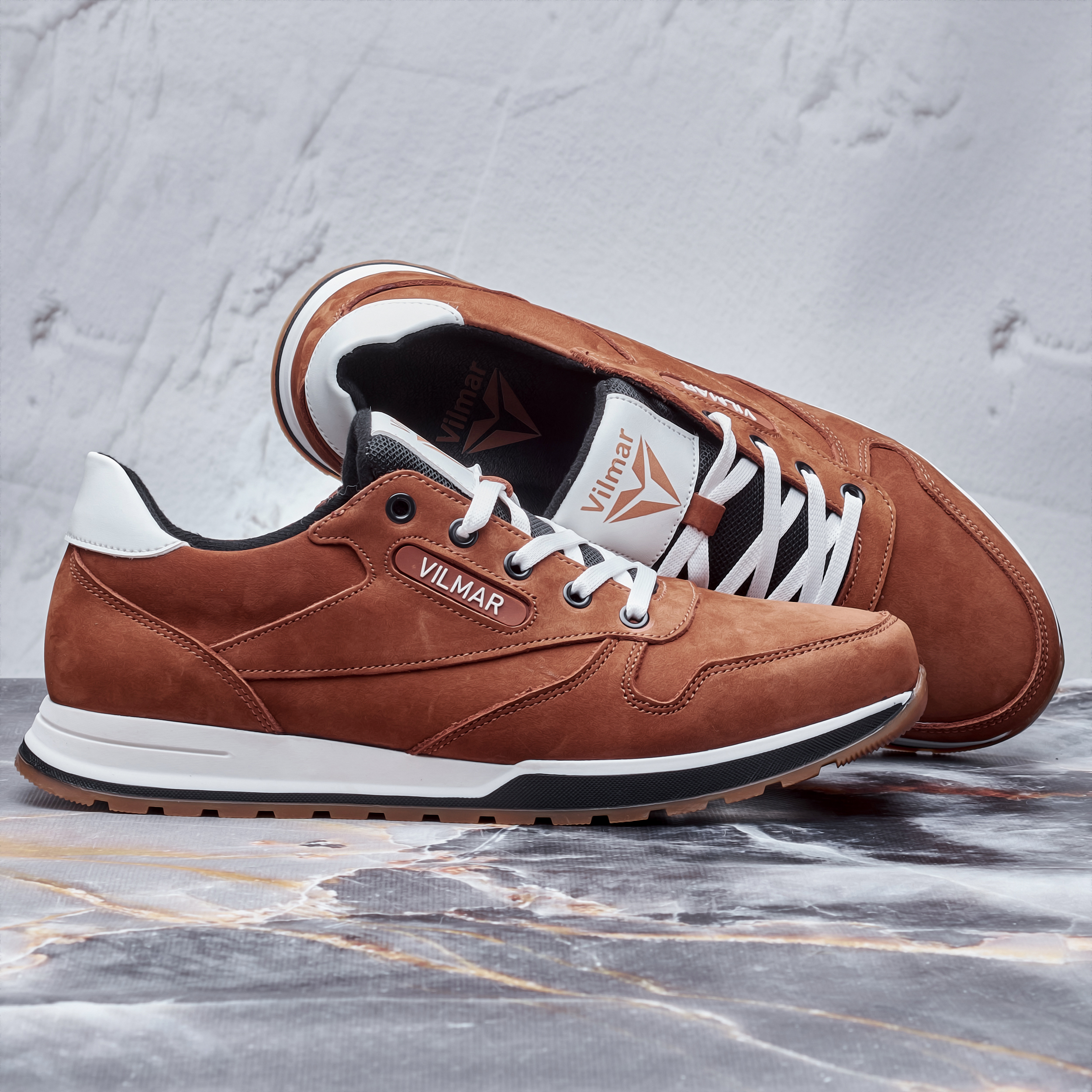 Чоловічі кросівки Vilmar з натурального нубука - практична модель для повсякденного носіння в місті. Теплий коричневий відтінок з контрастними білими деталями виглядає акуратно та сучасно, легко поєднується з джинсами та повсякденним одягом.