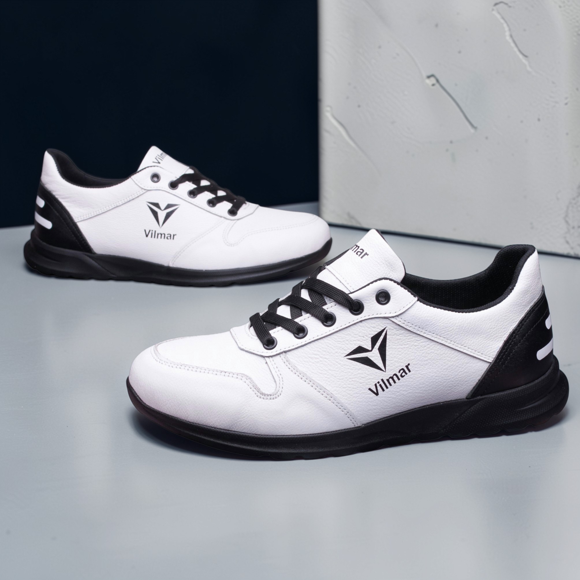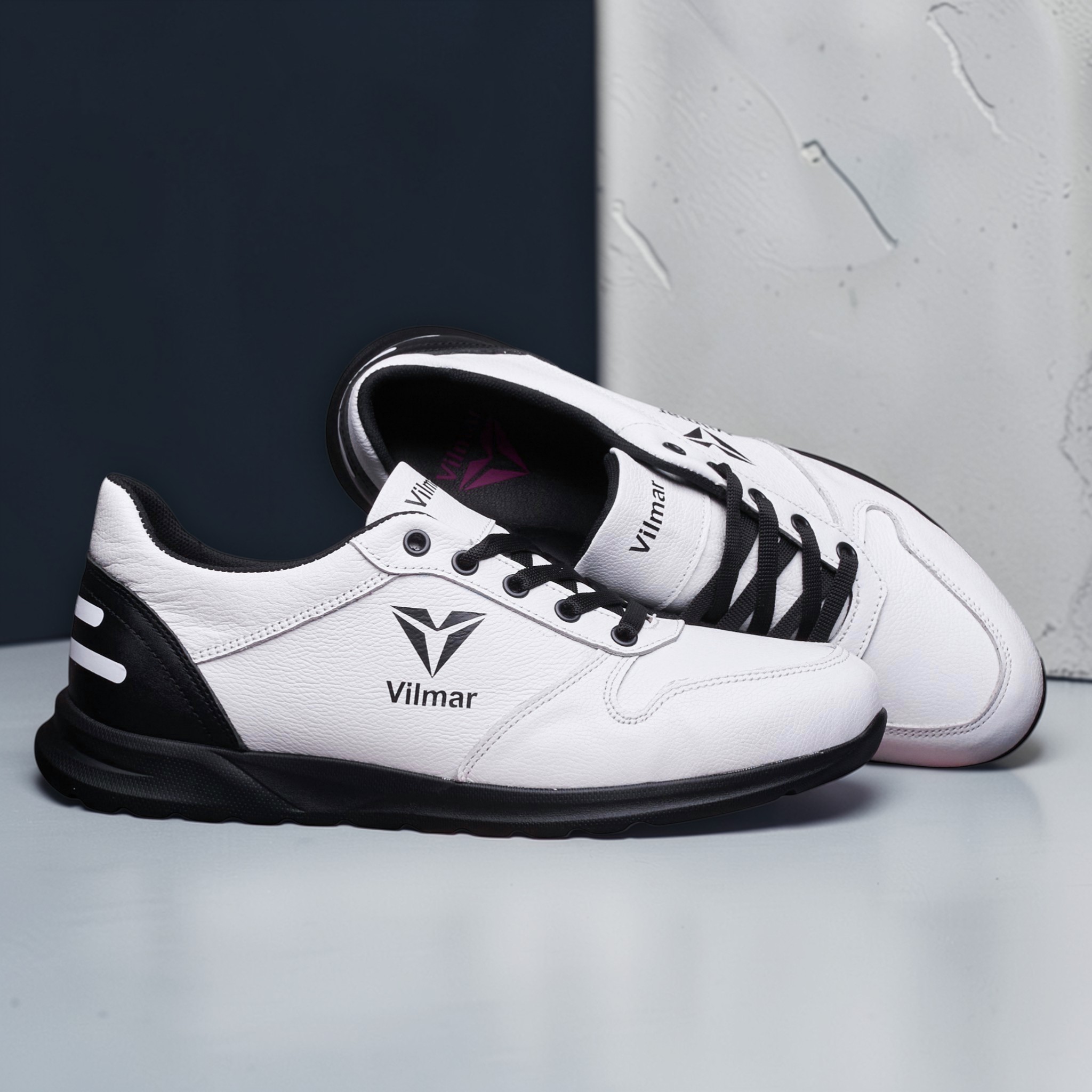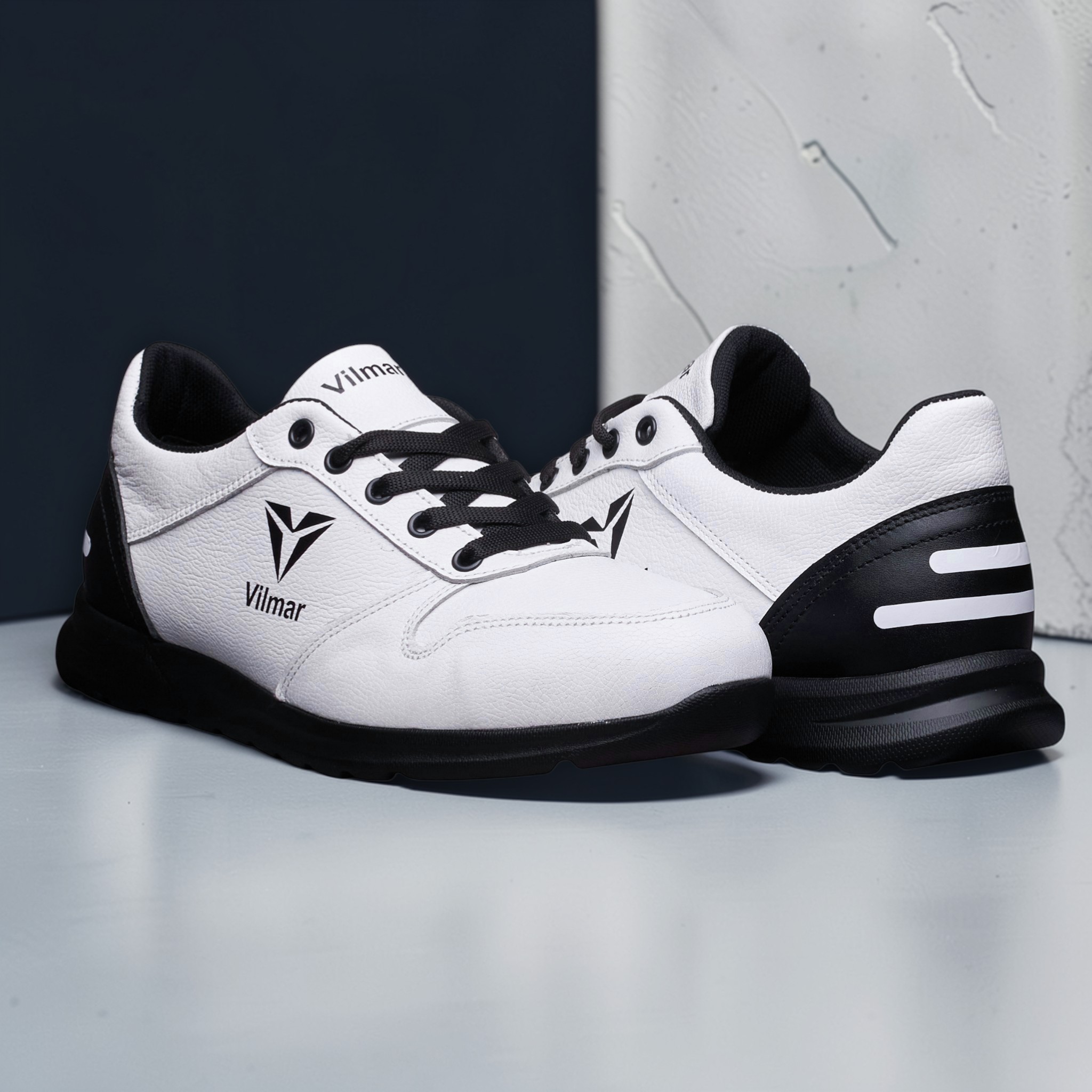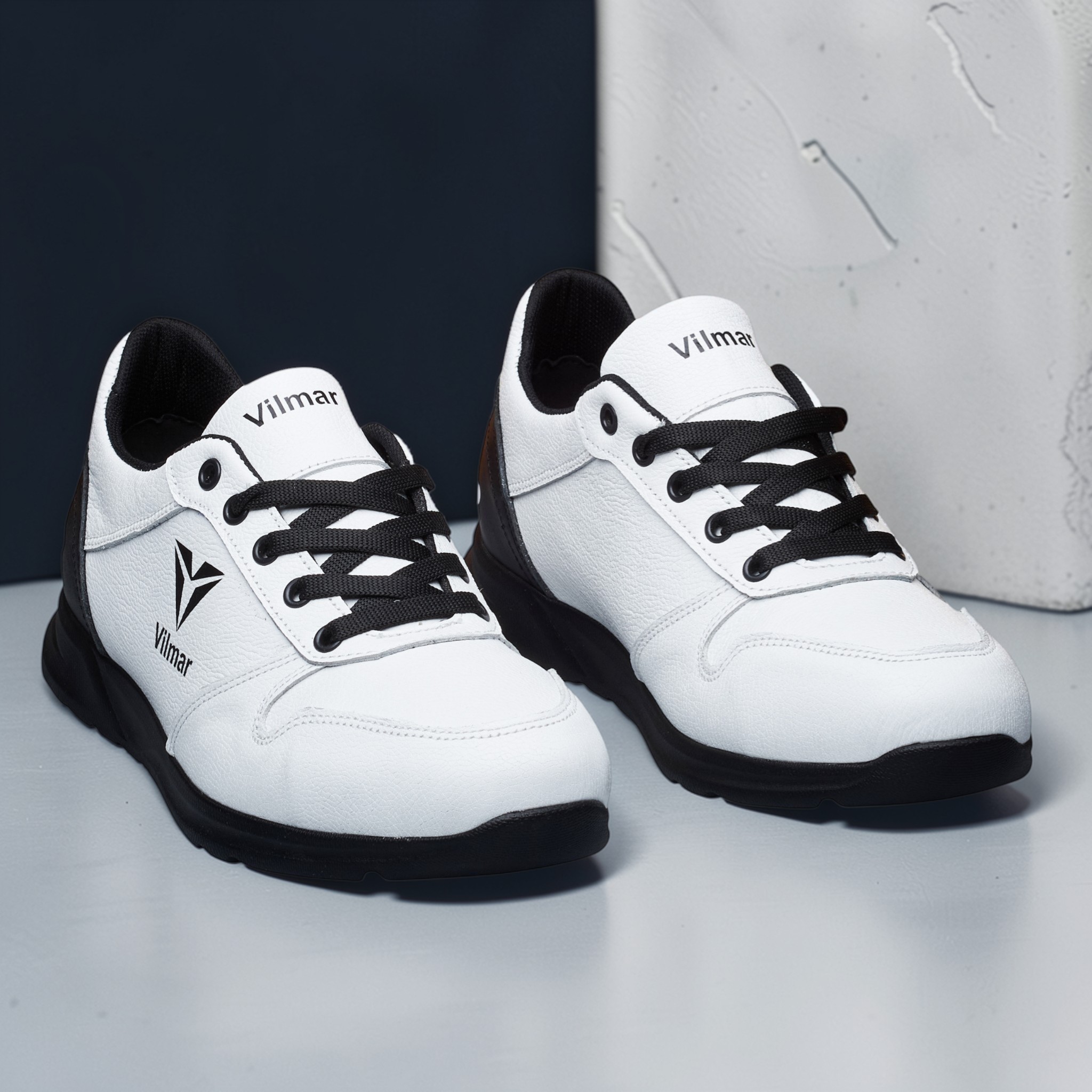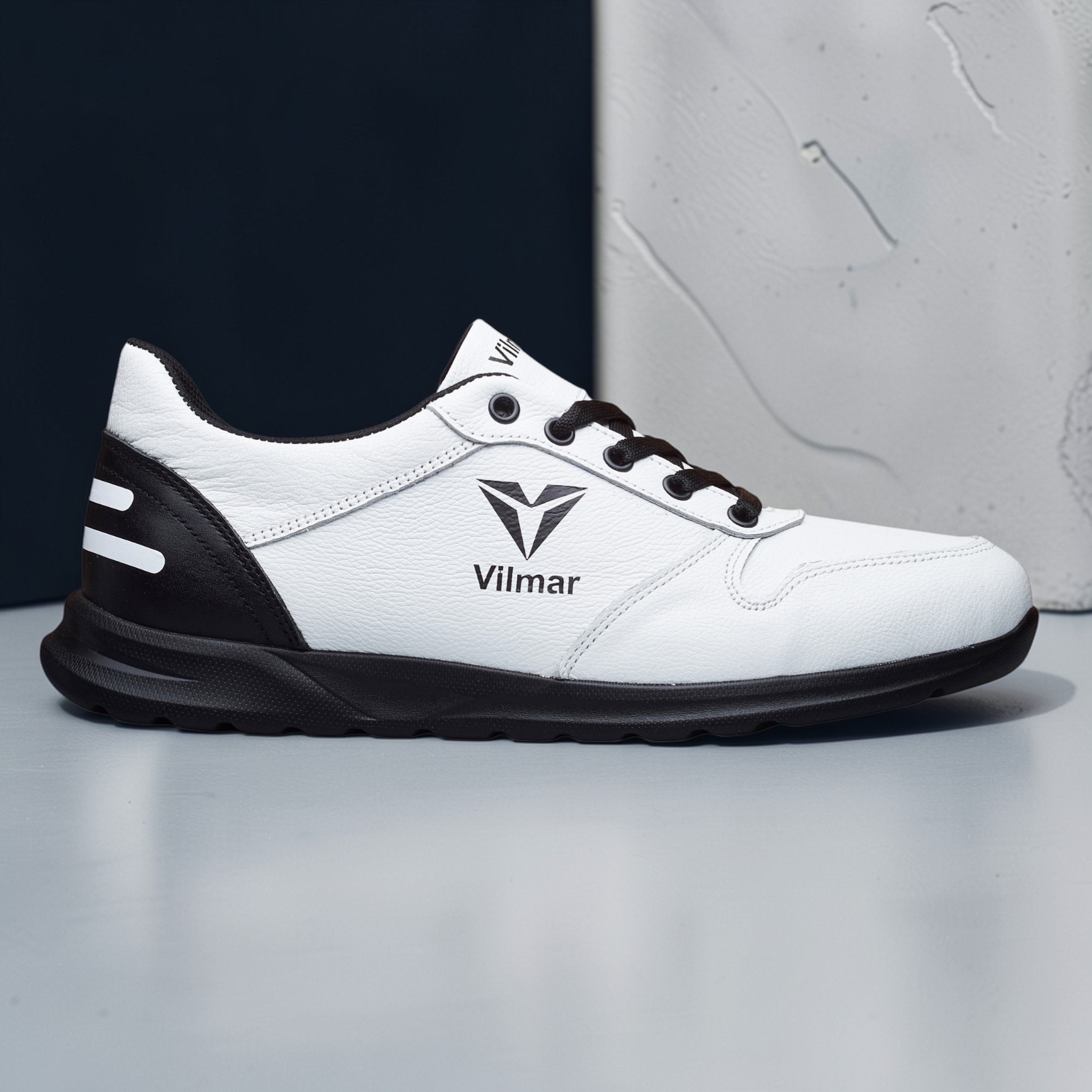 Чоловічі кросівки Vilmar із натуральної шкіри флотар у класичному білому кольорі з чорними вставками. Зерниста фактура шкіри надає взуття виразного вигляду, робить його більш практичним і допомагає довше зберігати акуратний зовнішній вигляд.