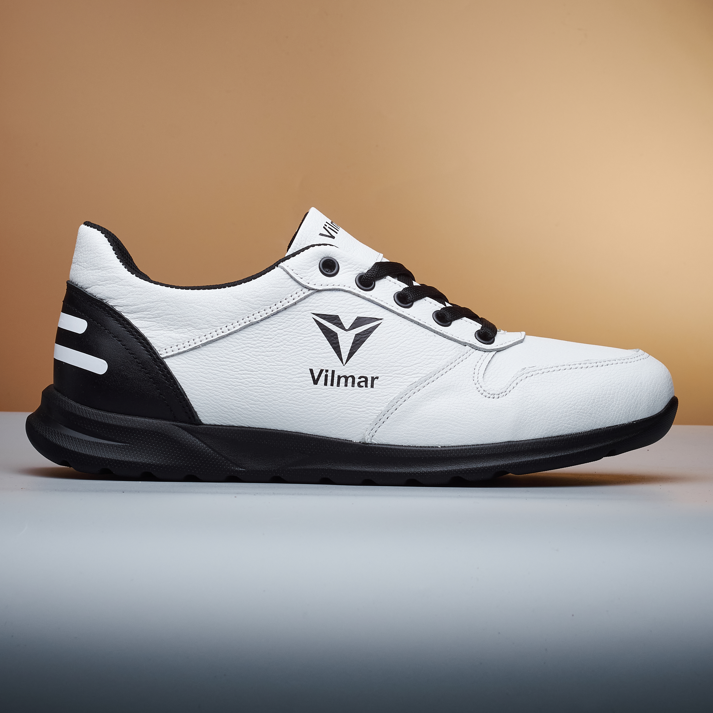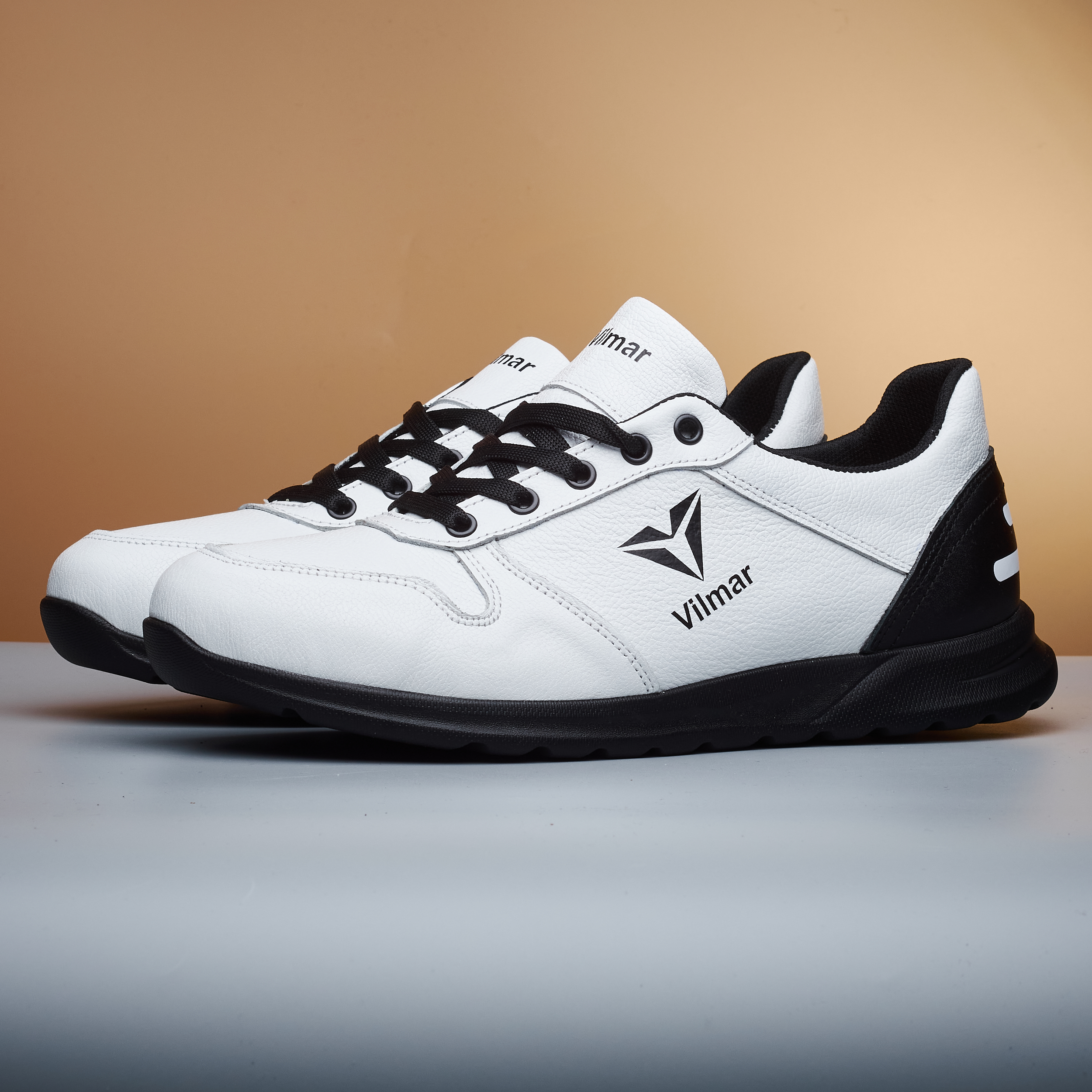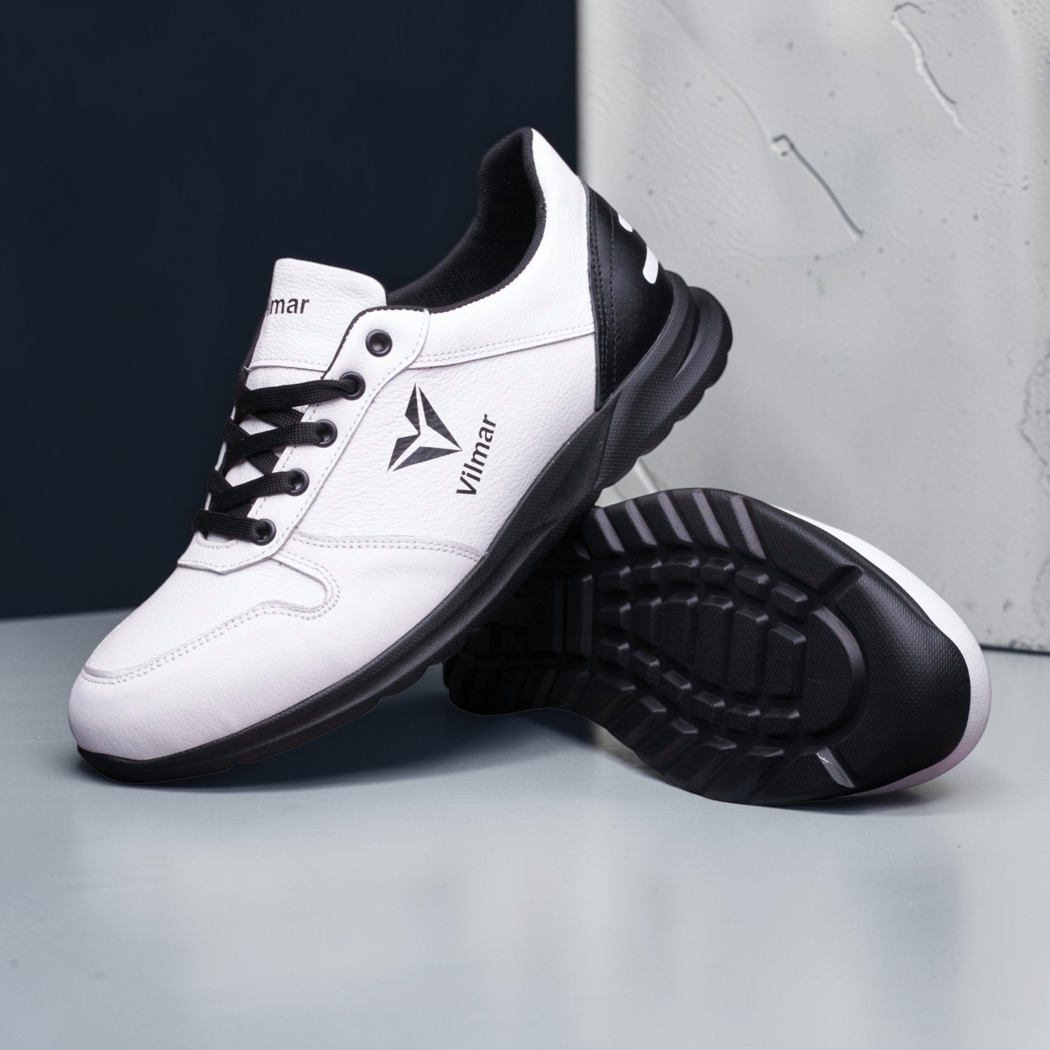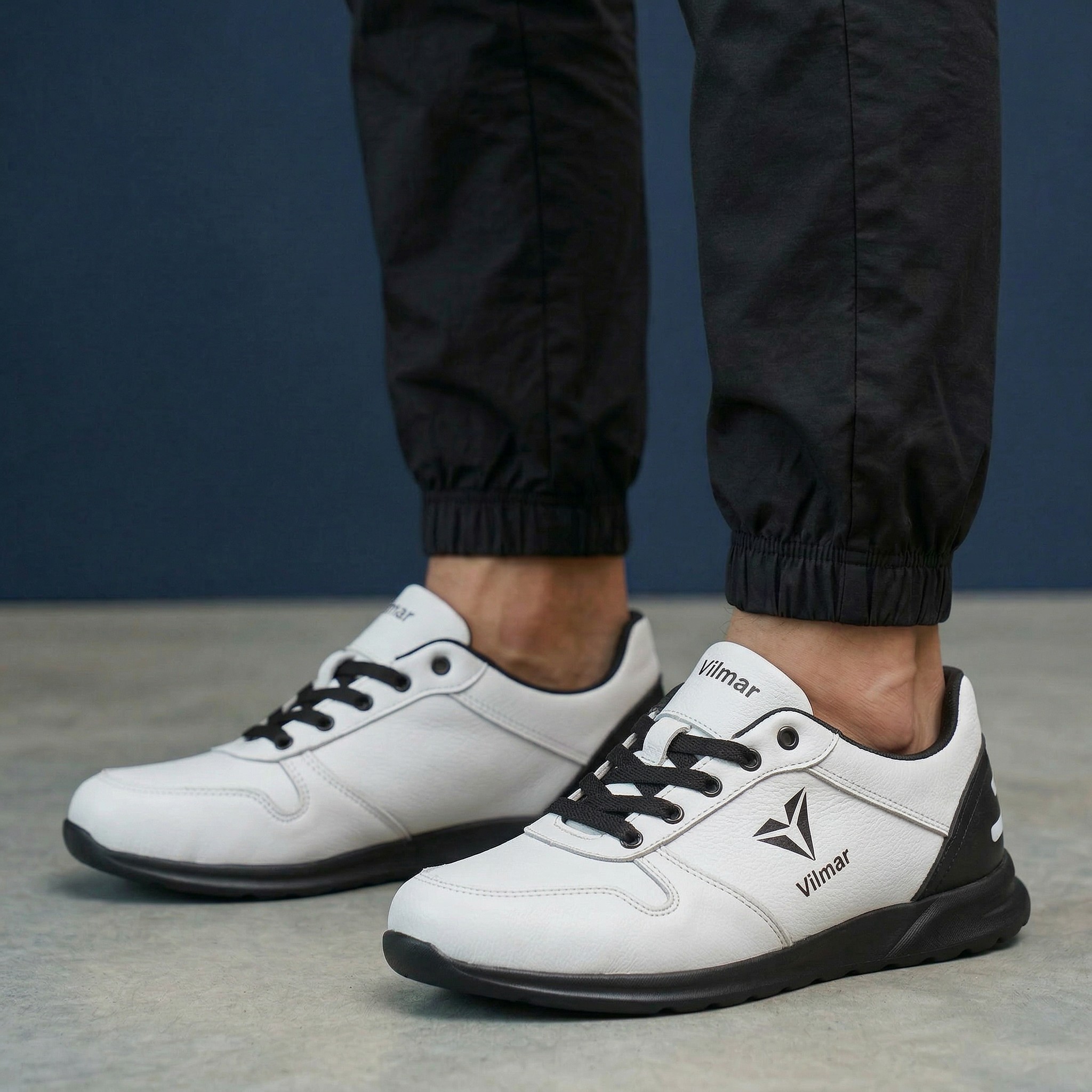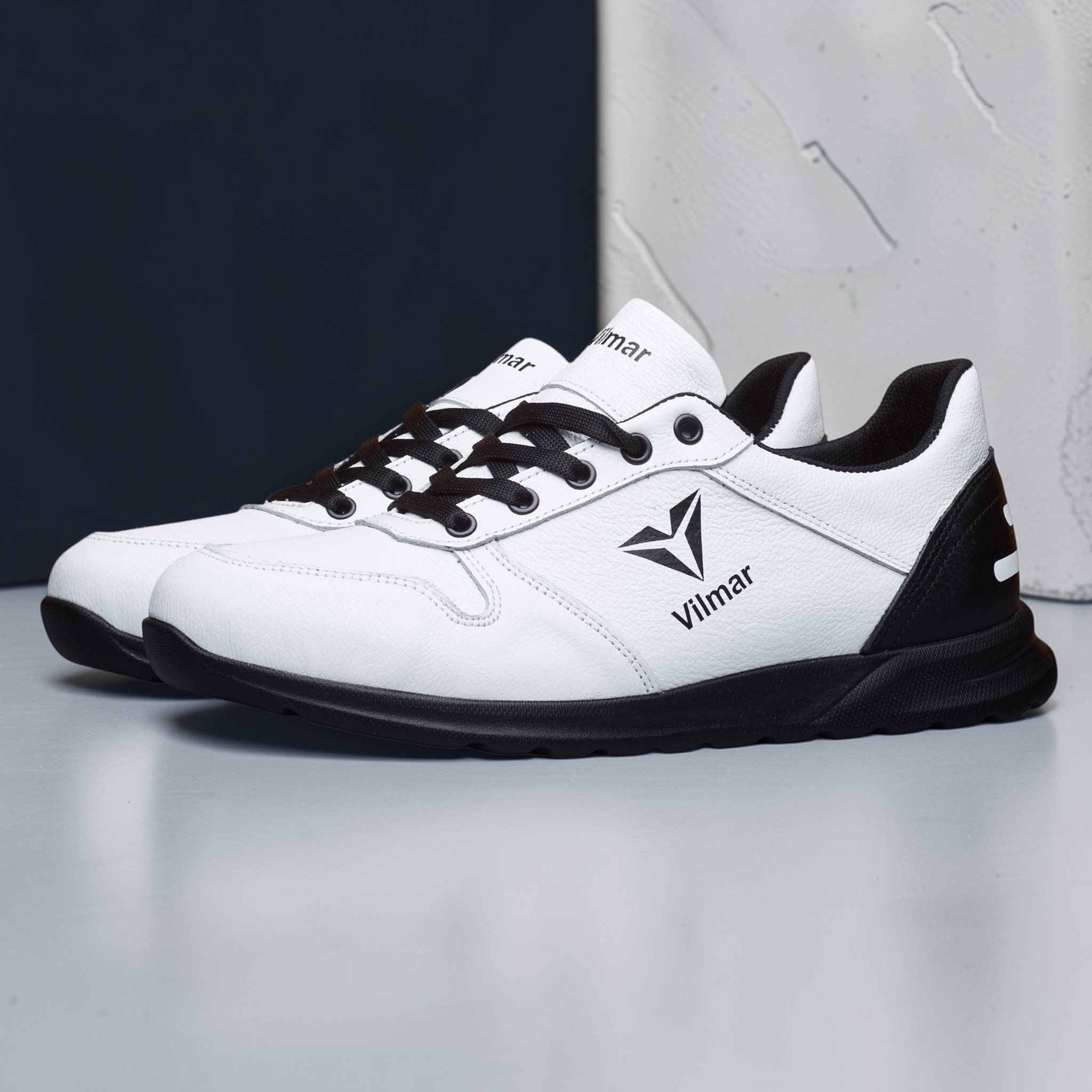Чоловічі кросівки Vilmar із натуральної шкіри флотар у класичному білому кольорі з чорними вставками. Зерниста фактура шкіри надає взуття виразного вигляду, робить його більш практичним і допомагає довше зберігати акуратний зовнішній вигляд.