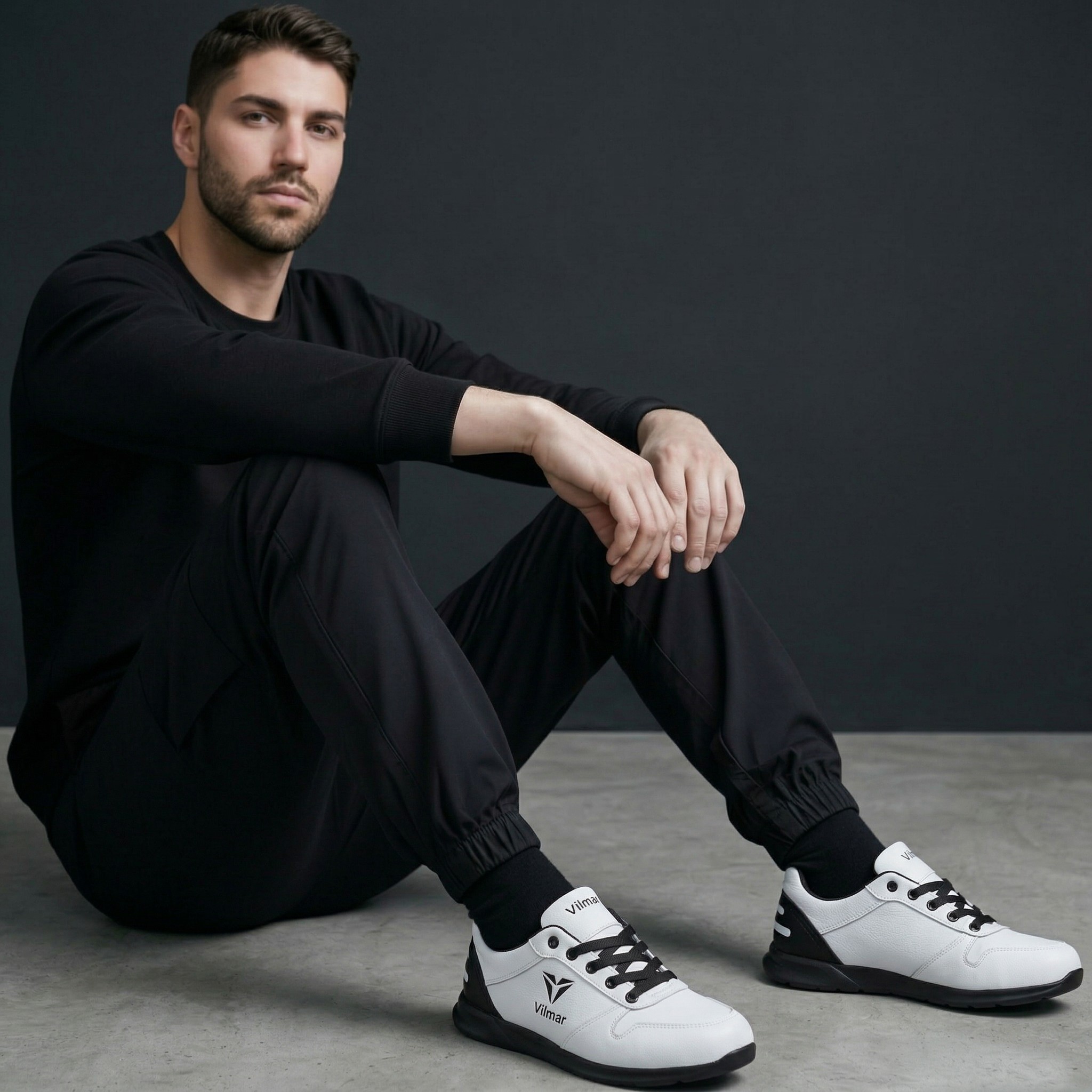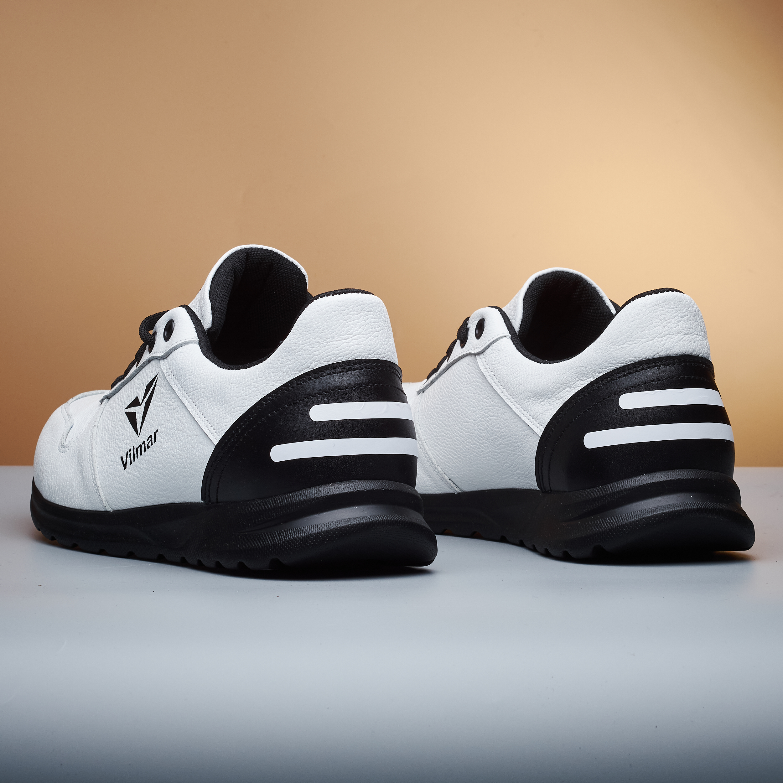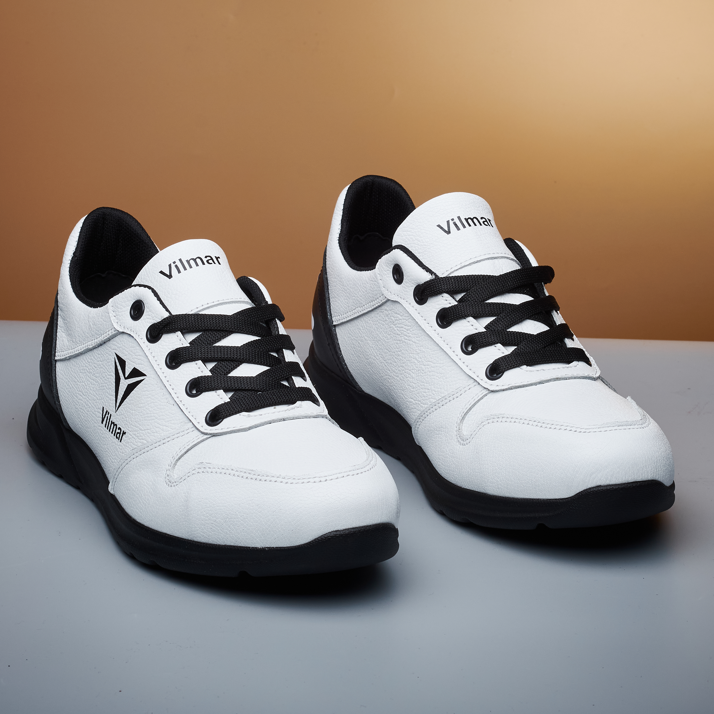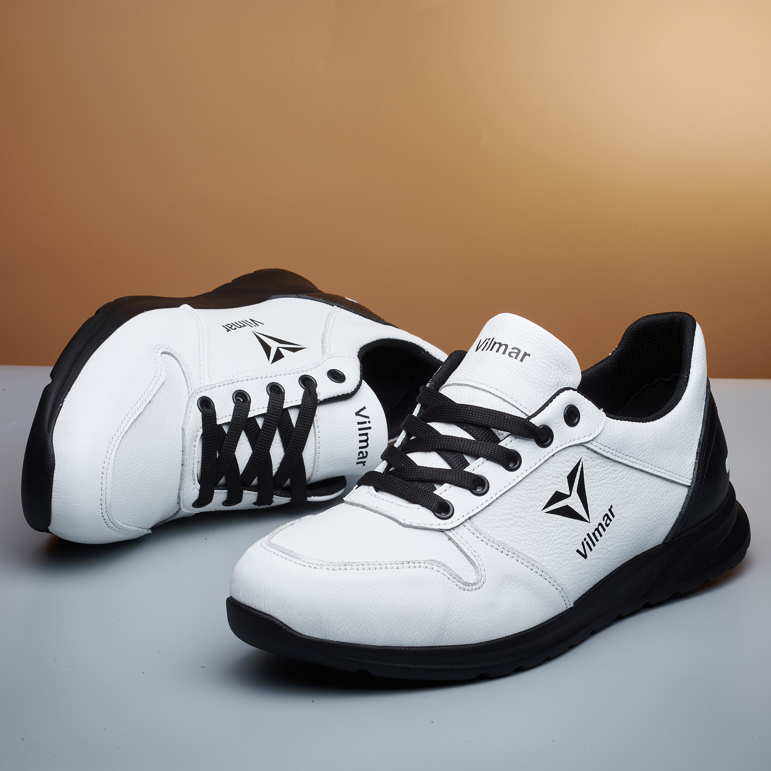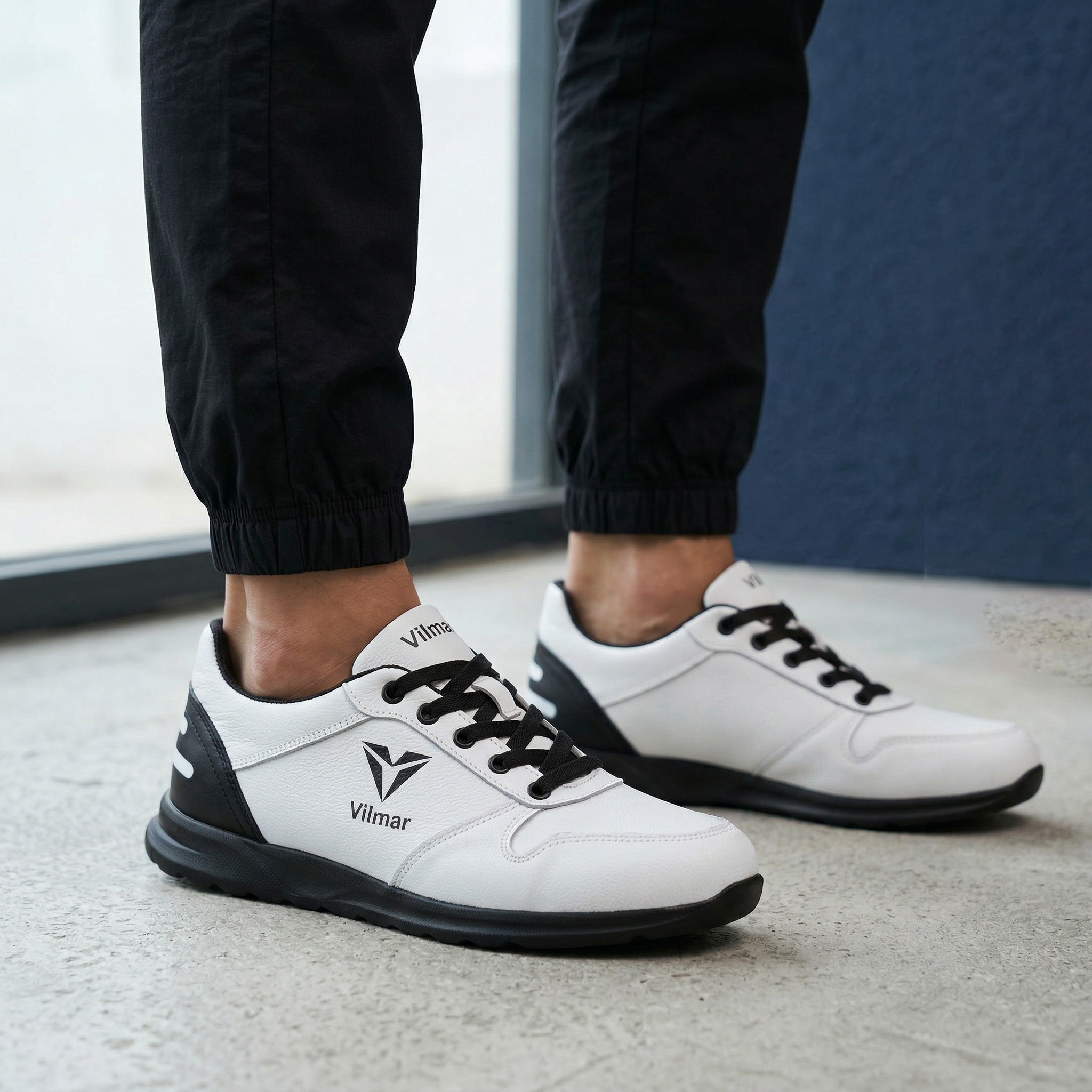 Чоловічі кросівки Vilmar із натуральної шкіри флотар у класичному білому кольорі з чорними вставками. Зерниста фактура шкіри надає взуття виразного вигляду, робить його більш практичним і допомагає довше зберігати акуратний зовнішній вигляд.